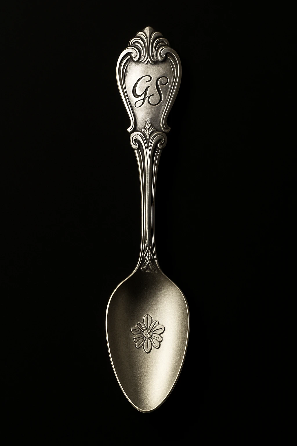 Detailed engraving of custom initials elegantly placed on a charming vintage spoon, showcasing a blend of personalized artistry and timeless design.